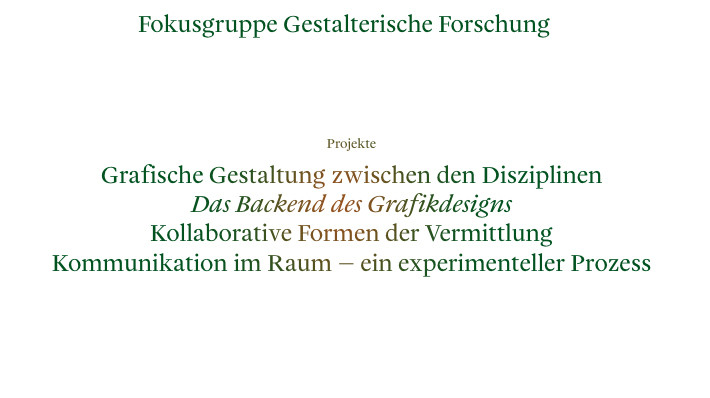 Die FOKUSGRUPPE GESTALTERISCHE FORSCHUNG besteht aus Gestalter*innen und Lehrenden der Visuellen Kommunikation. Ihr Fokus liegt daher auch auf genau diesen Bereichen – gestalterische Lehre und Praxis. Sie will Gestaltung über das Forschen erfahren und umgekehrt. Damit will sie sowohl auf den Begriff der Gestaltung als auch auf den der Forschung Einfluss nehmen. Gründungsmitglieder: Constanze Hein, Pascal Kress, Henrike Uthe, Ruven Wiegert Webdesign: Jonas Gerber, Lea Verholen