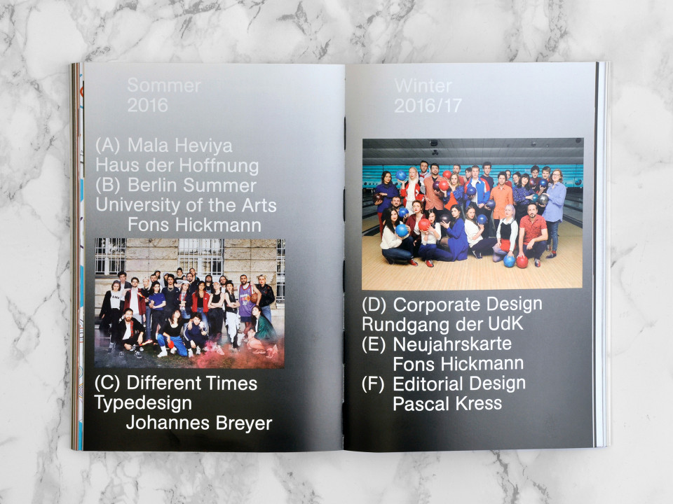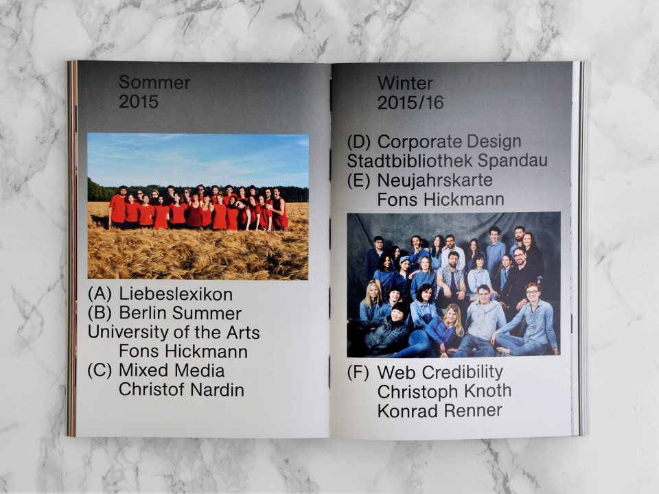 The book features one hundred works by students on the occasion of the tenth anniversary of Prof. Fons Hickmann’s graphic design class at UdK Berlin. It also includes contributions from alumni, former lecturers, and essays on the future of teaching.