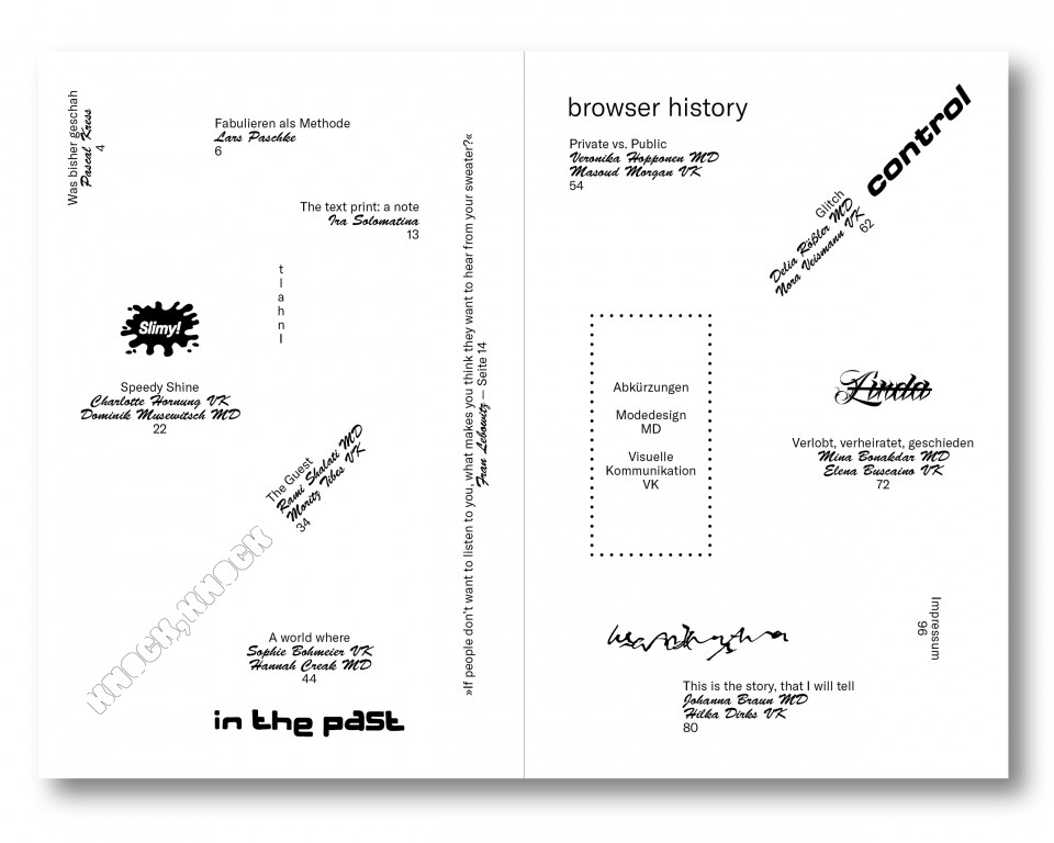 Students of visual communication and fashion design have worked in teams of two to create a collection that tells a story through both clothing and typography. The results are presented in this publication.